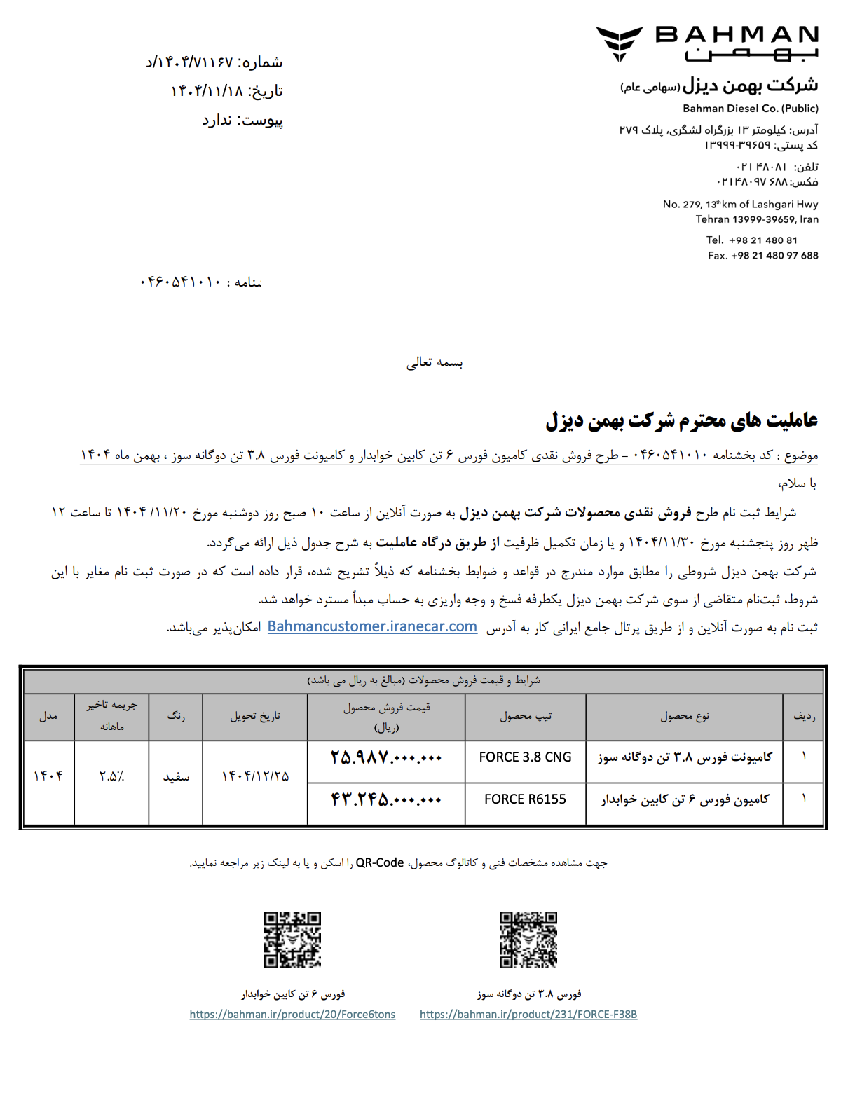در این طرح کامیونت فورس ۳.۸ تن دوگانهسوز (FORCE 3.8 CNG) با قیمت حدود ۲ میلیارد و ۵۹۸ میلیون تومان و کامیون فورس ۶ تن کابین خوابدار (FORCE R6155) با قیمت حدود ۴ میلیارد و ۳۲۴ میلیون تومان عرضه شدهاست. هر دو خودرو با مدل ۱۴۰۴، رنگ سفید و موعد تحویل ۲۵ اسفند ۱۴۰۴ به فروش میرسد.