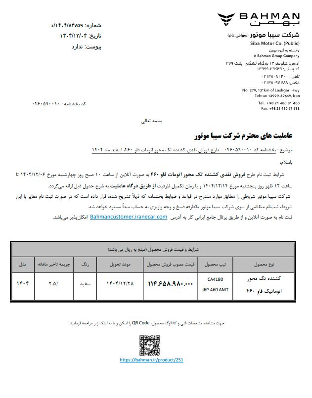 بر اساس اطلاعیه سیبا موتور، کشنده تک محور اتومات فاو ۴۶۰ با تیپ CA4180 با قیمت مصوب ۱۱۴ میلیارد و ۶۵۸ میلیون و ۹۸۰ هزار ریال با رنگ سفید و موعد تحویل ۲۸ اسفند ۱۴۰۴ عرضه میشود.
